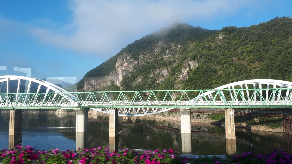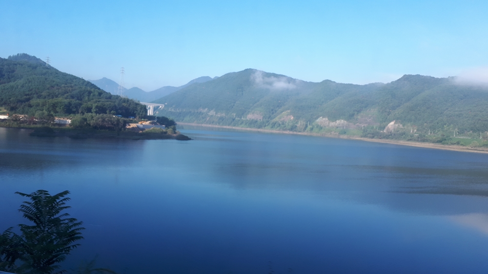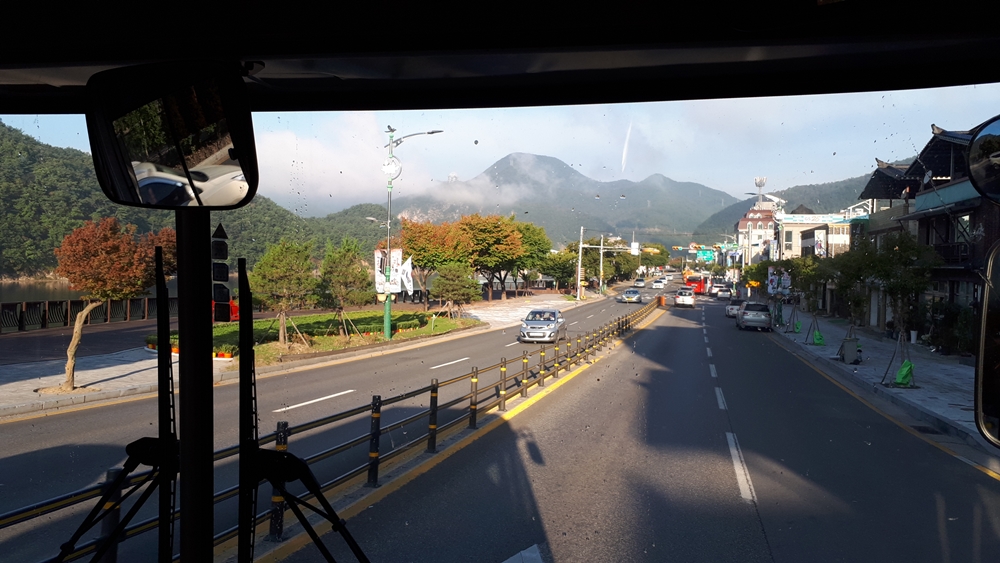 버스는 충주호 상류 상진대교를 지나 충주호반을 끼고 달립니다.