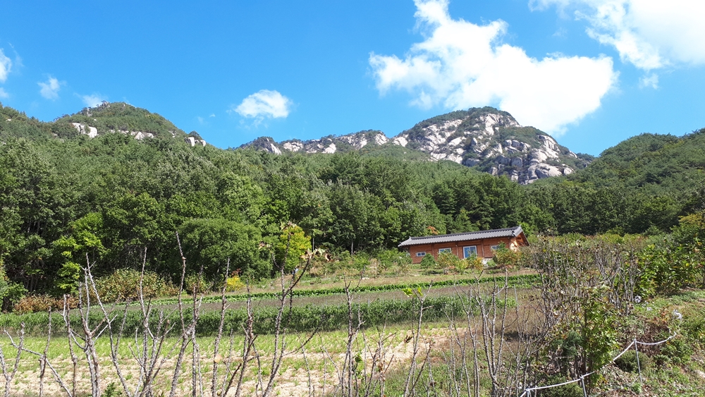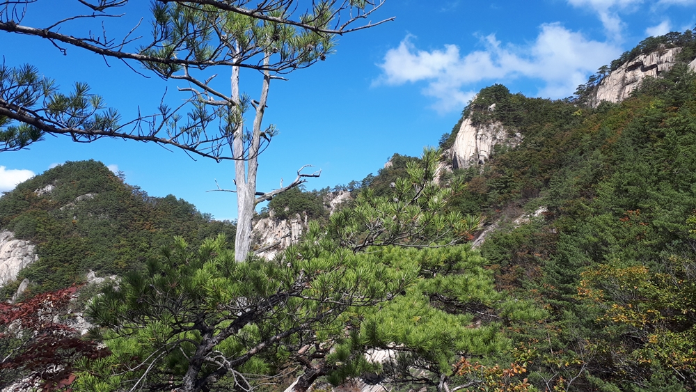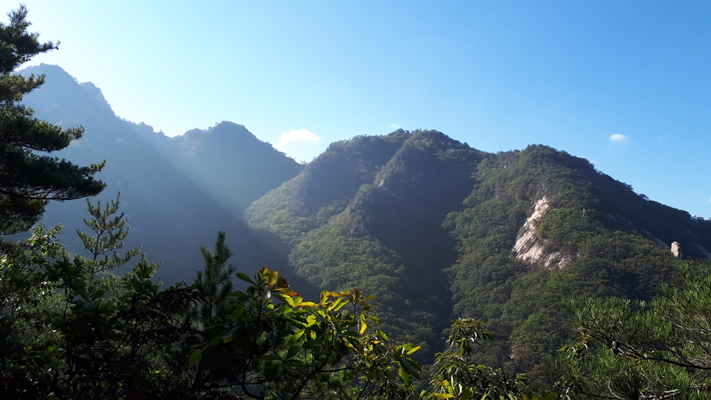 숨이 헐떡여 잠시 숨을 고르면서 맞은 편 산을 보니 경치가 아름답습니다.