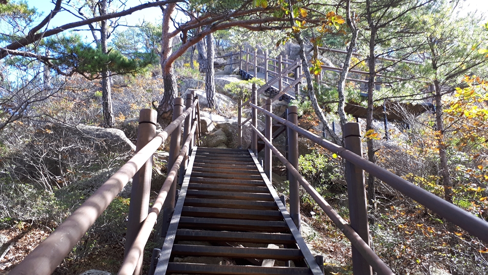 등산로는 계단과 암석길, 나무계단 길의 연속입니다.