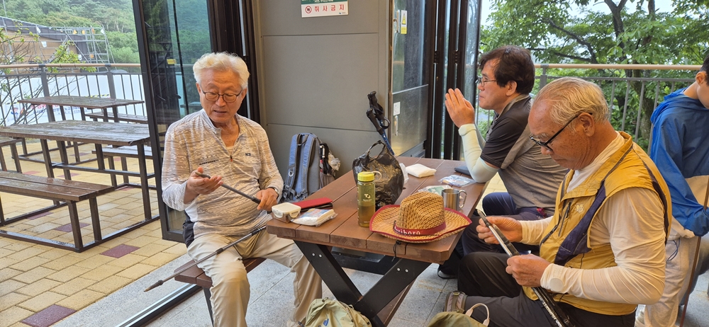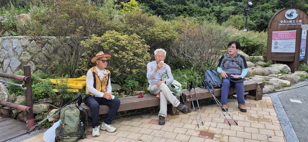 가을 야생화를 보려고 4명이 함께 노고단을 향하여 가던 중 노고단대피소에서 비를 만나 꼼짝없이 대피소휴게실에서 도시락 먹고 쉬다가 빗줄기가 조금 약해지자 대피소에서 비닐비옷(천원)을 사서 입고 하산하였다.