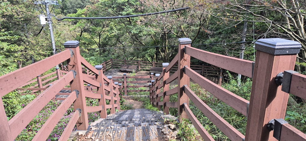 대원사계곡을 가로 지르는 등산로 다리(성황당・선녀・수박제・사랑바위・시앙굴・우화교) 6개와 선녀폭포, 데크계단 6개를 거쳐 정상에 도착하고 남릉(천룡사 방향)의 데크계단 3개와 비룡폭포를 지나 도립공원정류장에 도착하다.