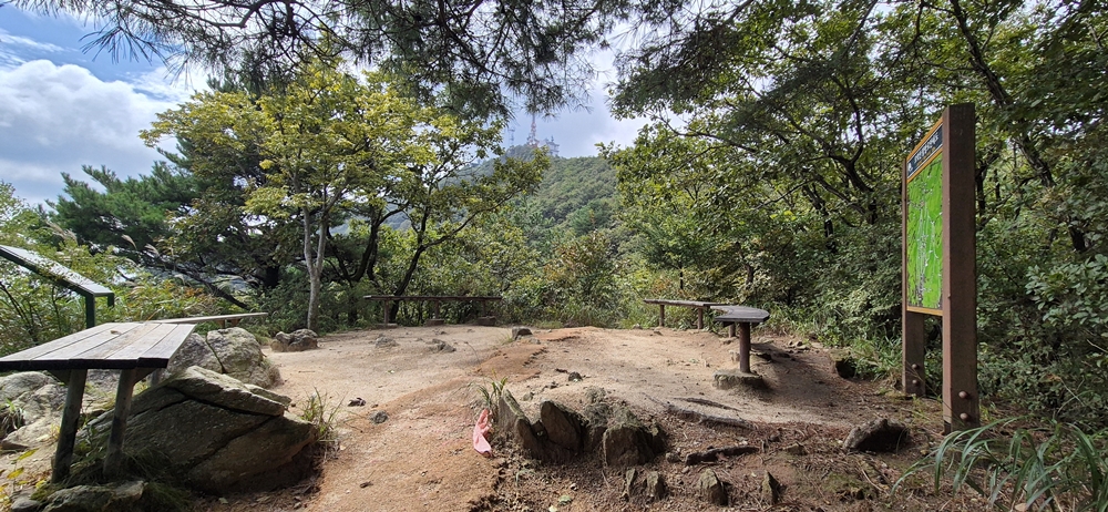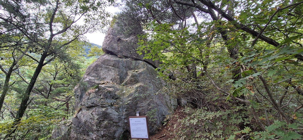 정상으로 가는 등산로 데크길 정비가 되어있다. 군산에서 왔다는 어떤 시니어와 조카 일행과 함께 정상표지석에서 인증 사진을 찍고 도시락을 꺼내 점심 식사를 마치고 남릉길로 하산하였다. 대감바위 지나 천룡사 방향으로 하산하다 미끄러져 스틱이 부러지고 넘어졌다. 옆구리가 조금 아픈 것이 멍이든 모양이다. 천룡사 계곡의 비룡폭포도 힘차게 내리쏟는 물줄기가 시원한 소리를 지른다.
