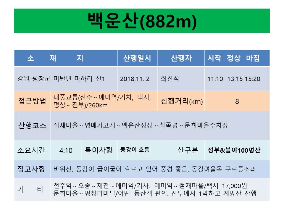 평창 백운산은 동강이 휘돌아 나가는 오지에 위치하여 있어 평창 미탄면에서 백운산 아래 문희마을 들어가는 버스가 하루에 두 번 있고 신동읍에서 들어가는 교통편은 잘 알 수도 없었습니다.