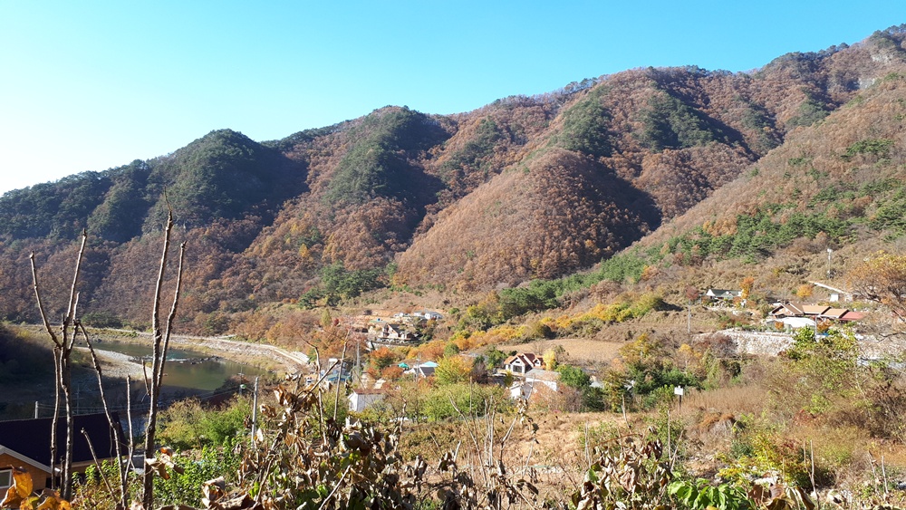 예미역에서 네 명의 택시번호를 제공받아 네 번째 기사와 연락이 되어 그 택시(요금 17,000원)로 동강이 흐르는 강변의 점재마을로 갔습니다.