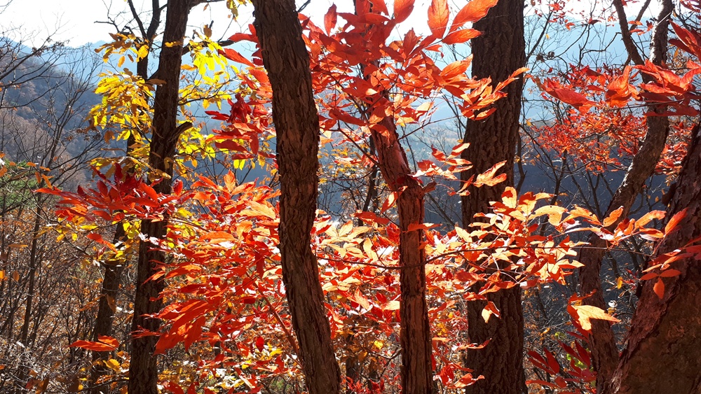 오르내리기가 계속되어 칠족령 200m 남겨두고 문희마을 길로 빠져 경사 급한 산허리를 돌아가니 복자기나무 단풍이 곱습니다.