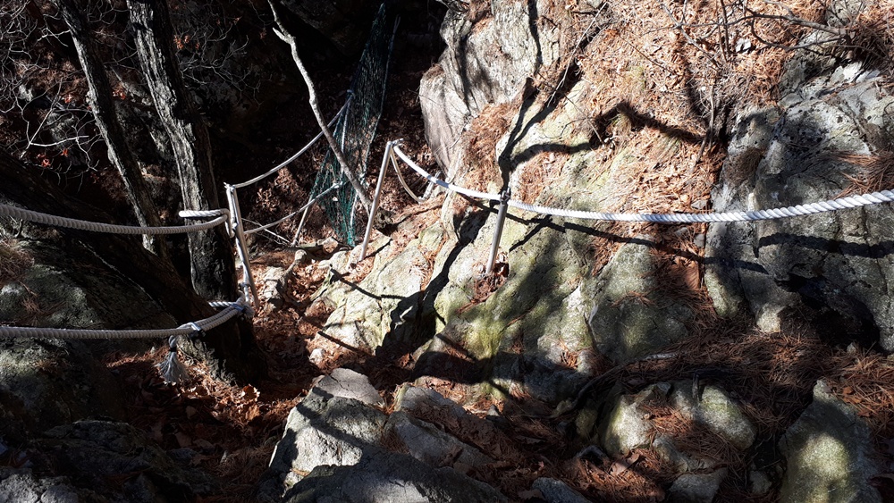 유난히 솟은 봉우리 옆으로 돌아가는 길은 산행 안전을 위하여 밧줄이 쳐져서 잡고서 올라갔습니다.
