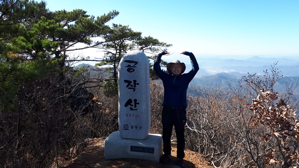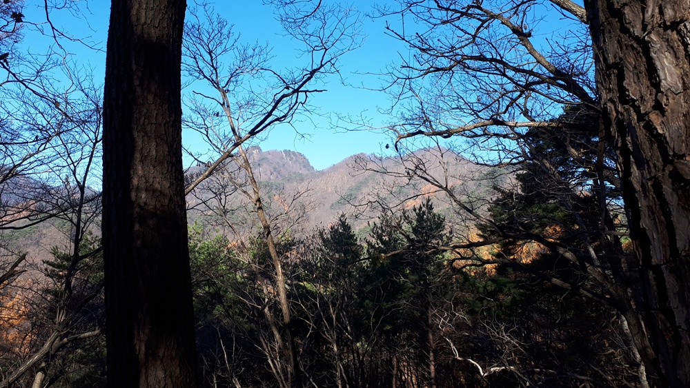 저 멀리 소나무가 서있고 유난히 솟은 봉우리와 그 뒷 봉우리가 아마 공작산 정상일 것 같습니다.