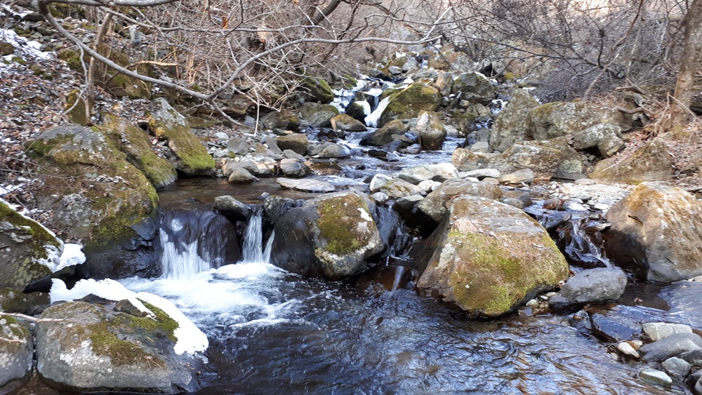산골짜기 바람은 매우 차갑고 쌀쌀하였으며 입구에서 수백 미터 올라가자 눈길이었고 골짜기 흐르는 물은 얼음 밑으로 흐르고 있었습니다.