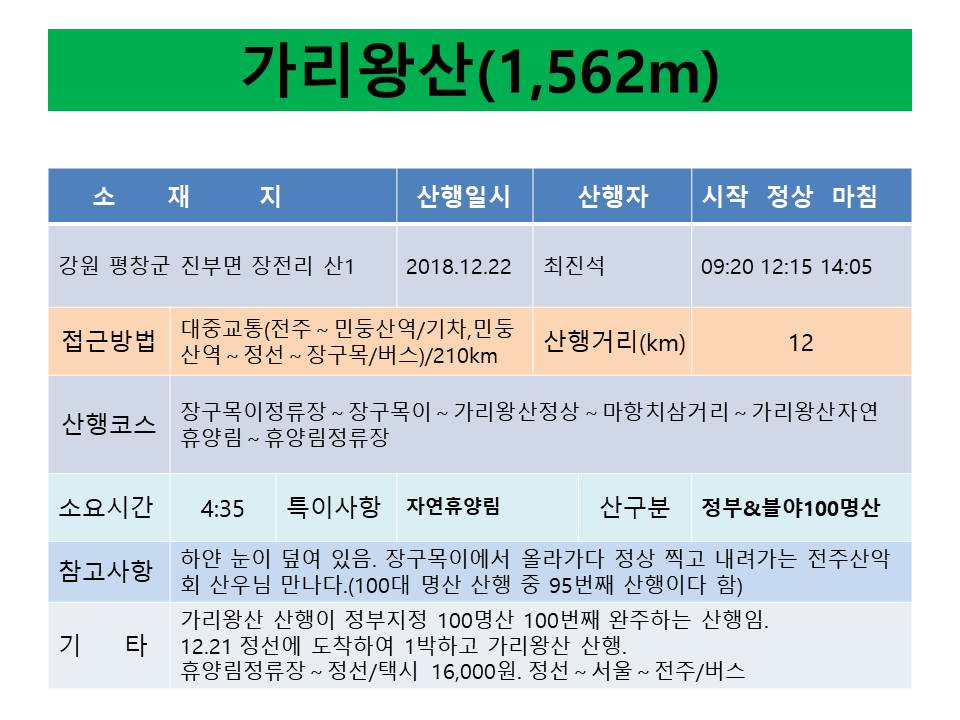 100대 명산 도전 마지막 산, 가리왕산을 다녀올 날을 기다리던 중 날씨가 그리 춥지 않으며 가을철 산불기간으로 입산통제가 끝난 2018.12.22.(토)로 정하였습니다.