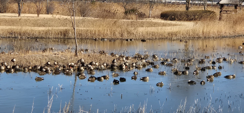 생태공원 안 연못에는 수많은 겨울 철새 오리류가 미동도 없이 가만히 앉아서 햇볕을 쬐거나 일부 오리류는 수영을 하고 있었으나 사람들이 가까이 가도 도망가지 않았다.