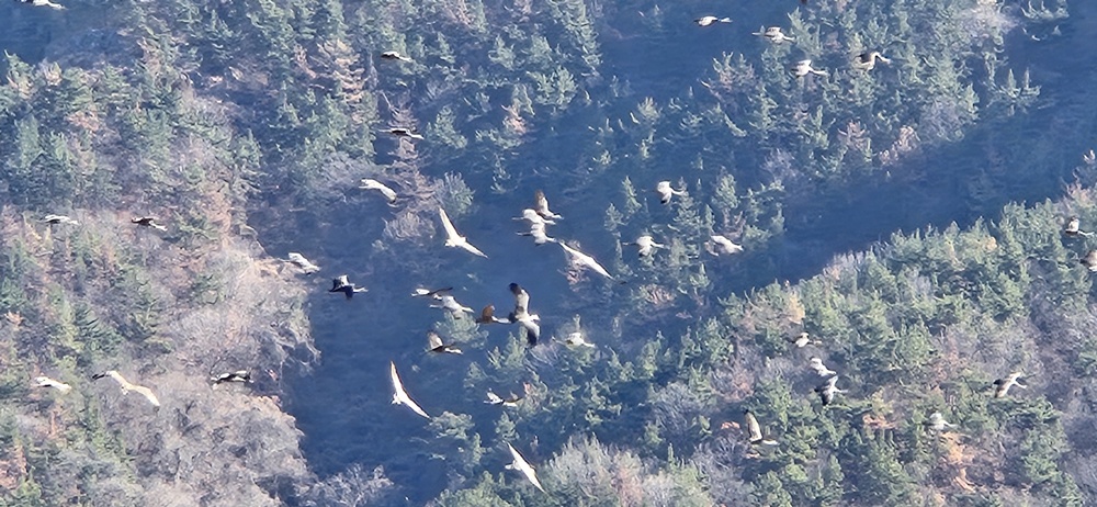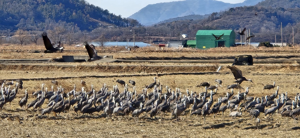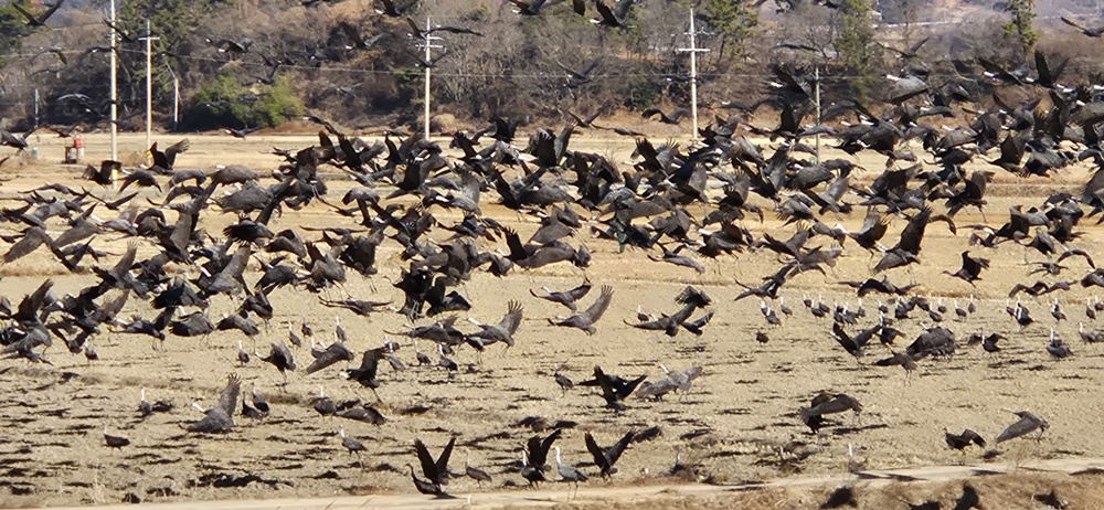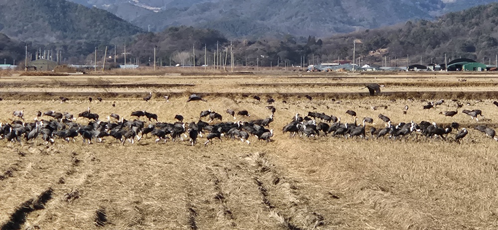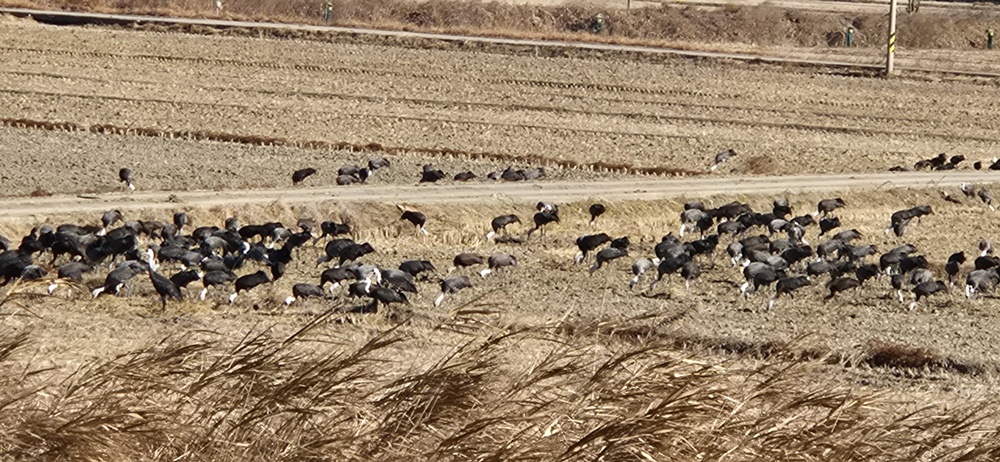 갈대울타리 밖 추수 끝난 논바닥에 수를 헤아릴 수 없을 만큼의 흑두루미가 논바닥을 뒤집으며 먹이활동을 하고 있어서 장관이었다.