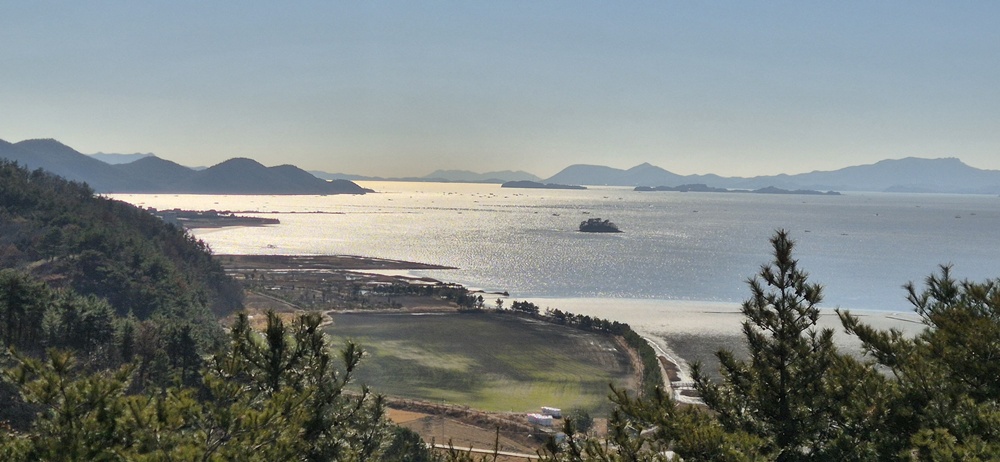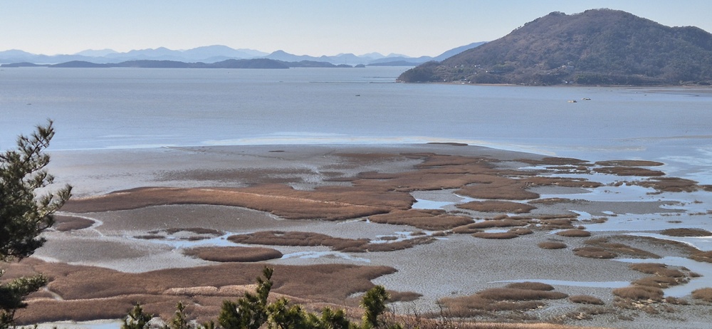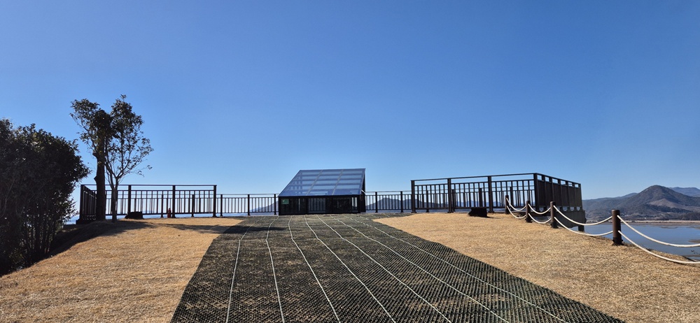 용산전망대 가는 산길에 5개의 쉼터와 2개의 데크다리가 있었고 가끔 쉼터전망대에서 동천의 파란 물줄기와 누런 갈대밭과 방조제 안의 넓은 들판을 조망하였다.