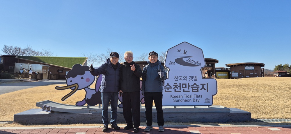 순천만자연생태공원 매표소 앞 ‘순천만습지’ 간판에 흑두루미와 짱뚱어 그림이 함께 그려져 있어서 우리 일행 셋이 활짝 웃으며 인증샷을 하였다.
