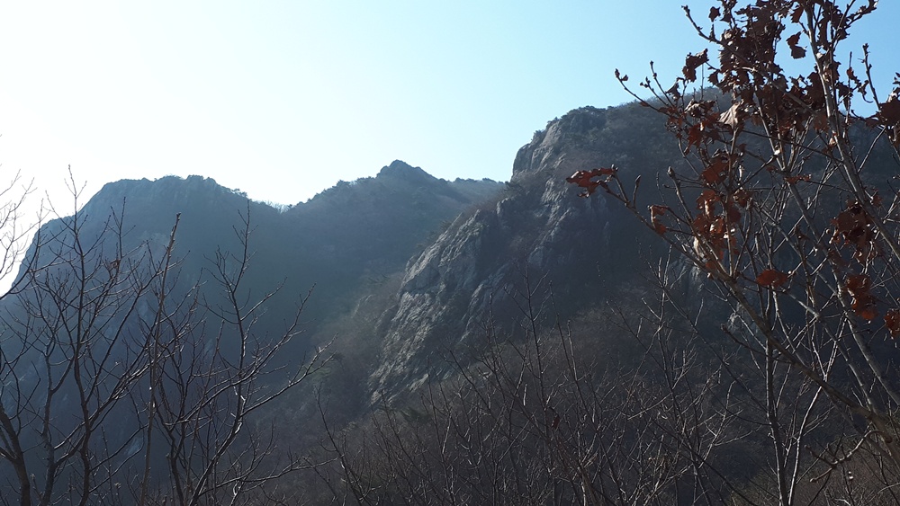 계곡 양편으로 거대한 암봉이 수문장처럼 솟아있었으며 하산 길에 언뜻언뜻 보이는 거대한 바위봉우리 원적봉, 잔치봉 모습이 위엄 있게 다가왔습니다.