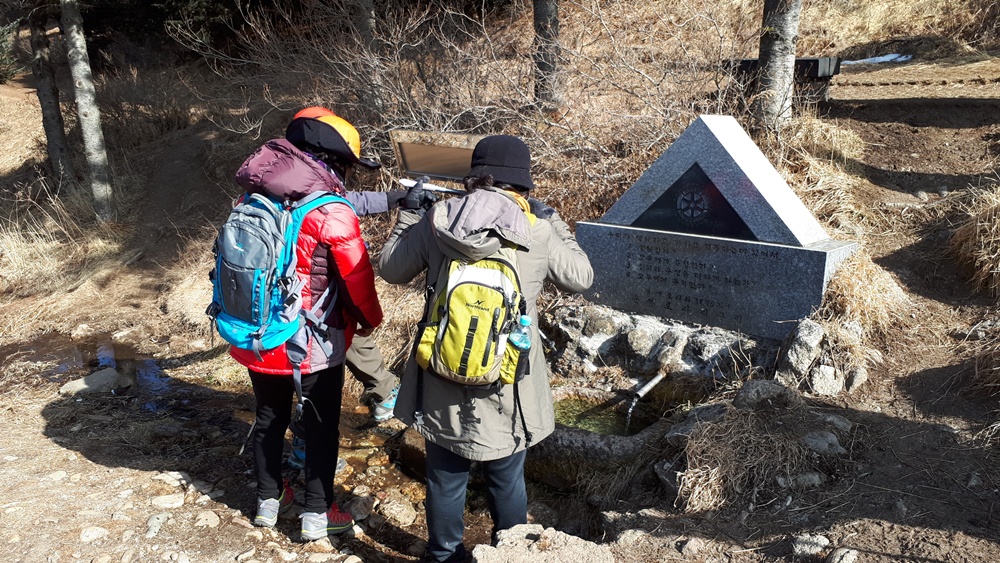 등산로변 천연 샘가에서 표주박으로 한 모금 물을 들이켜 보니 그리 차지 않았습니다.
