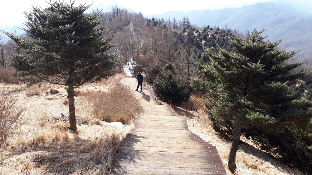 낙엽송과 주목이 조림되어 있는 사이 길을 따라 나무테크 계단을 올라서니 한 무리의 등산객이 내려오고 있었습니다.