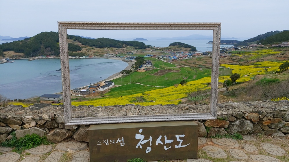 틀에서 조금 떨어져 바라보니 도락리 해변과 청산도항과 유채꽃밭과 청보리밭과 푸른 숲과 푸른 바다가 어우러져 환상적인 아름다움을 선사하였다. 참 멋졌다.