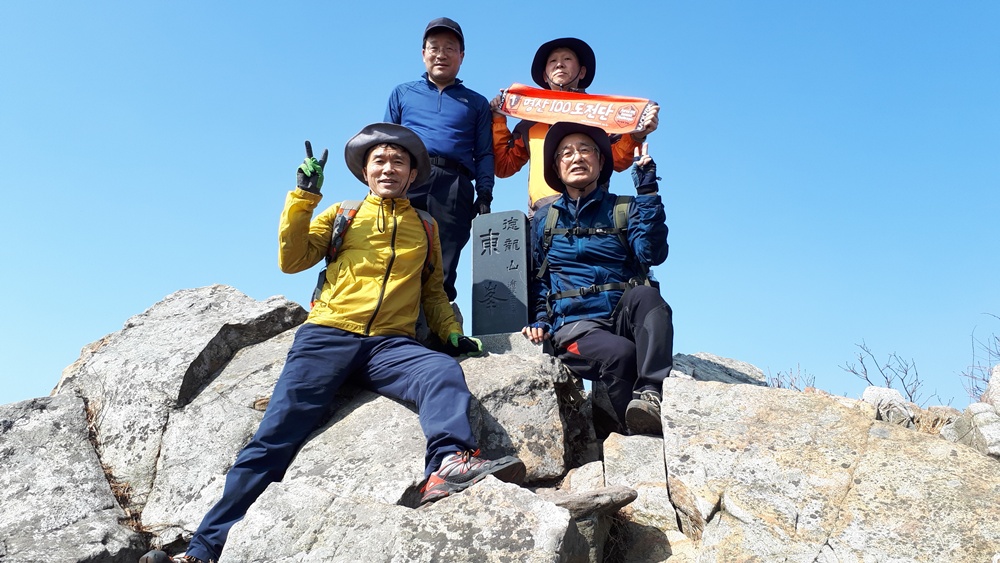 11:30 덕룡산 동봉(420m)에 도착하니 먼저 온 등산객들이 인증사진을 찍고 있어서 조금 기다리다 단체 사진과 개인 인증 사진을 찍었습니다.